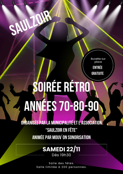 La municipalité et Saulzoir en fête vous proposent une soirée rétro (années 70-80-90) le samedi 22/11 dès 19h30 ! Buvette sur place.